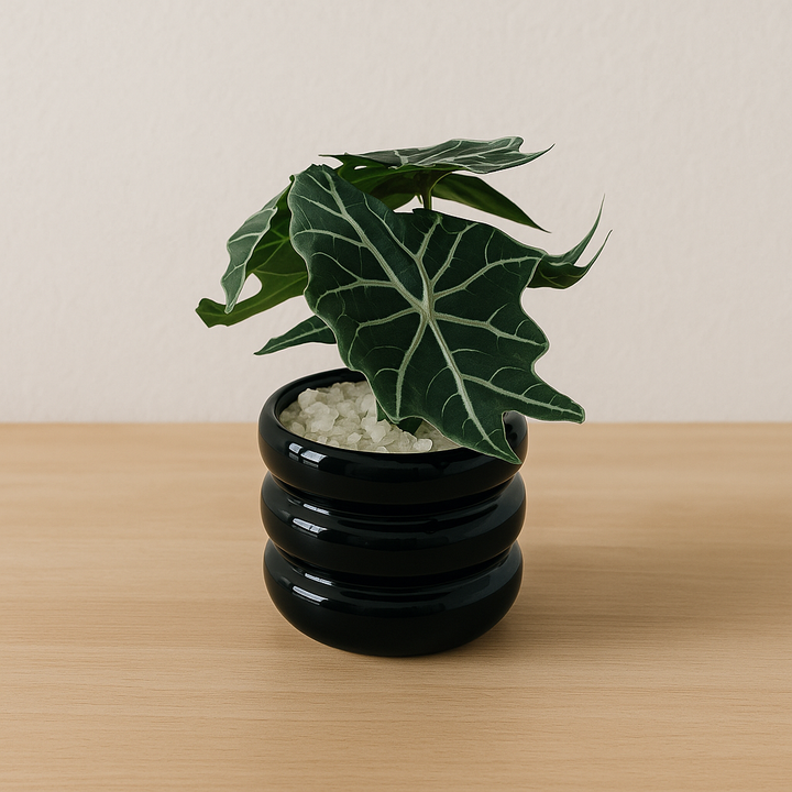 This refined decorative planter showcases an Alocasia plant with dark green, arrow-shaped leaves highlighted by vivid white veins. Nestled in a sleek, glossy black ceramic pot featuring smooth, layered contours, it offers a contemporary and sophisticated aesthetic. Ideal for enhancing coffee tables, shelves, or office desks, it introduces a natural element that elevates interior spaces with subtle elegance and style.