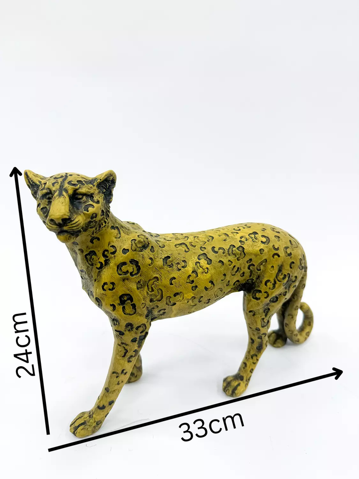 This golden-yellow leopard figurine showcases intricate black spots and a lifelike posture, complete with a curled tail and expressive features. Expertly crafted, it adds a refined yet striking exotic element, enhancing the character of any interior décor with its realistic and elegant presence.