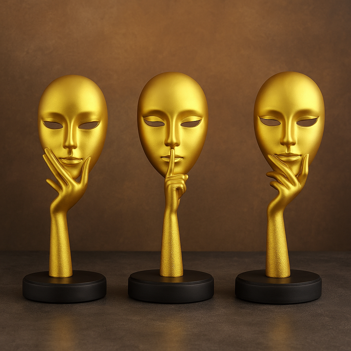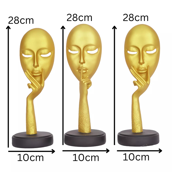 This set of golden abstract face sculptures embodies modern elegance and artistic expression. Each sculpture features a smoothly finished golden mask complemented by expressive hand gestures that symbolize thought, silence, and reflection. Finely crafted with attention to detail and mounted on sturdy black bases, these pieces command attention on console tables, shelves, or office desks. Ideal for enhancing living rooms, reception areas, or workspaces, they add a refined touch of sophistication and contemporary style.