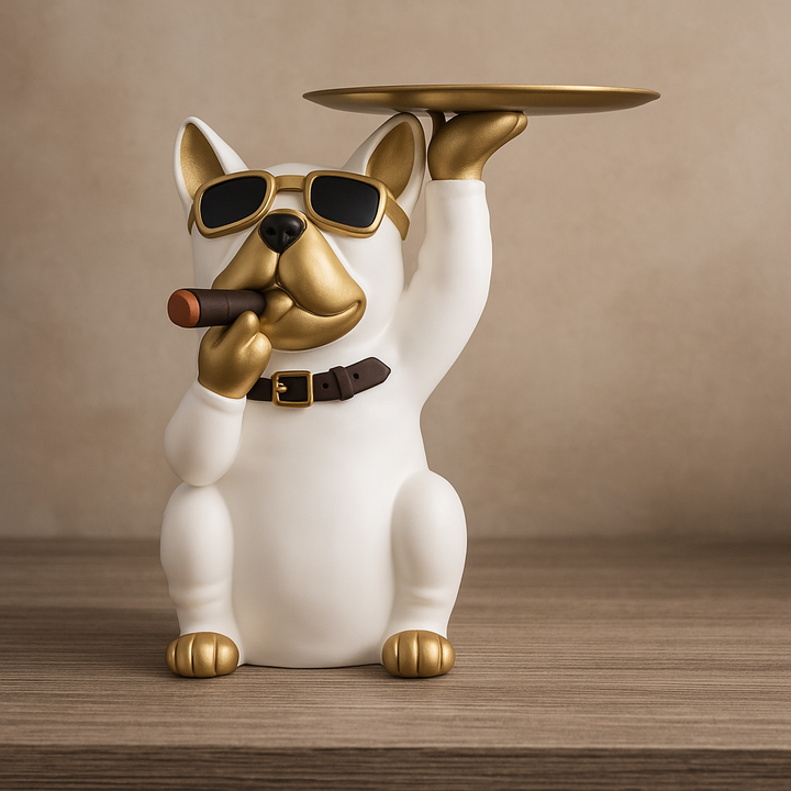 This modern French bulldog figurine blends artistic flair with practical use, featuring sleek golden accents that highlight its playful character. Sporting sunglasses and holding a cigar, the figure raises a golden tray, offering a unique way to display small items or serve guests. Ideal for elevating living rooms, offices, or reception spaces, it delivers a sophisticated yet bold statement that complements contemporary décor with expert style.