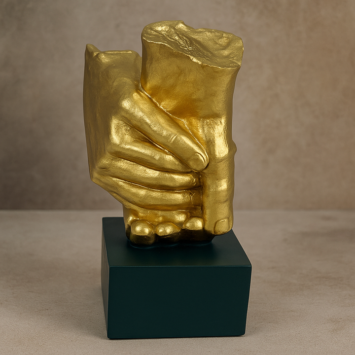 تمثال ديكوري ذهبي يعرض يدين متشابكتين، يرمز إلى الوحدة والترابط بأسلوب فني معاصر. يتميز بتشطيب ذهبي لامع يضفي عليه فخامة، مزود بقاعدة داكنة تعزز التوازن البصري والحداثة. مثالي لإضافة لمسة مميزة على الكونصول، رفوف الكتب، أو م