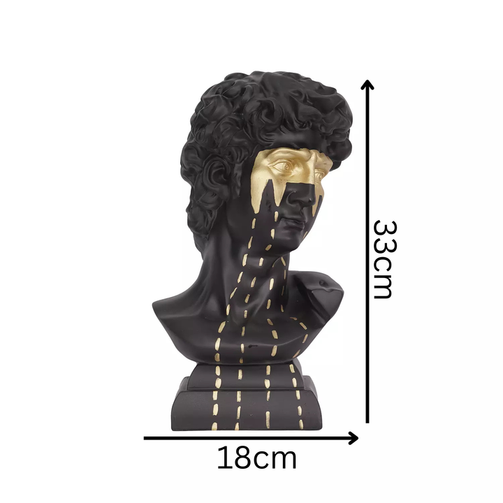 This contemporary sculpture reinterprets classical Greco-Roman busts through a striking matte black finish and meticulously detailed curls and facial features. Its standout characteristic is a gold-painted mask that encircles the eyes, extending into tear-like streaks flowing down the face and chest. This combination of traditional form and modern artistic accents offers a sophisticated centerpiece, perfect for elevating the ambiance of living spaces, offices, or curated gallery environments.