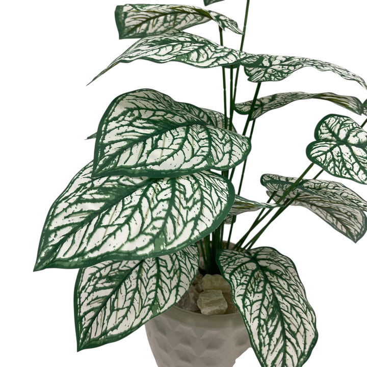 Enhance your space with this Artificial Tree featuring 28 vibrant green leaves accented by distinctive white veins. Housed in a textured beige ceramic pot, its modern and minimal design seamlessly complements any desk, shelf, coffee table, or living area. This maintenance-free plant offers a natural, refreshing aesthetic, perfect for elevating your environment with lasting greenery and effortless style.
