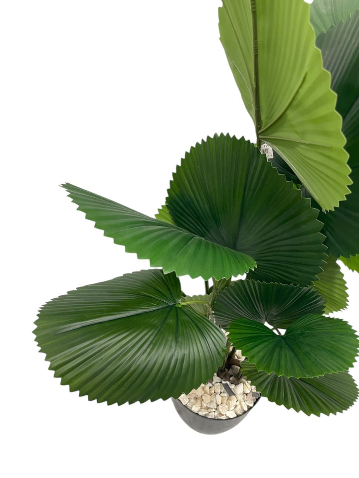 A tall artificial décor plant featuring layered fan-shaped leaves in rich green tones for a natural and bold presence. It comes in a sleek black pot filled with white decorative stones, creating a stylish contrast that suits modern interiors. Perfect for entryways, living rooms, and office corners for a fresh, maintenance-free greenery touch.