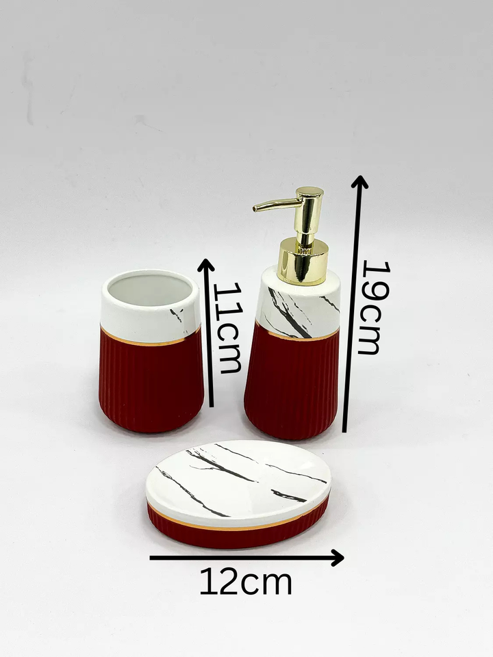 This three-piece bathroom accessory set blends sophistication with practicality, featuring a soap dispenser with a golden pump, a tumbler, and a soap dish. Each item showcases a deep red base topped with white marble-effect accented by delicate black veins and a polished golden rim, delivering a contemporary yet luxurious aesthetic. Ideal for elevating modern bathroom decor while providing essential functionality.