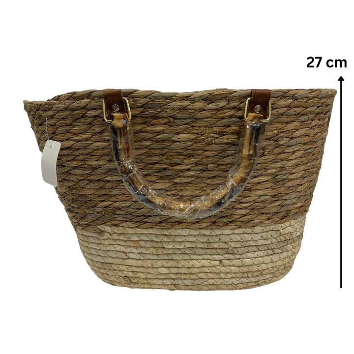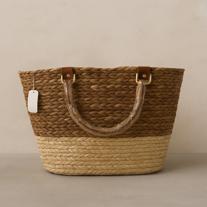 This expertly crafted woven straw tote combines function and style with its two-tone natural hues—warm brown above and light beige below. Designed for durability, it features sturdy leather handles secured by elegant gold-tone hardware. Its spacious interior offers versatile use, ideal for shopping, beach outings, or daily errands. The natural woven texture highlights a refined boho aesthetic, making it a sustainable and fashionable choice for everyday wear.