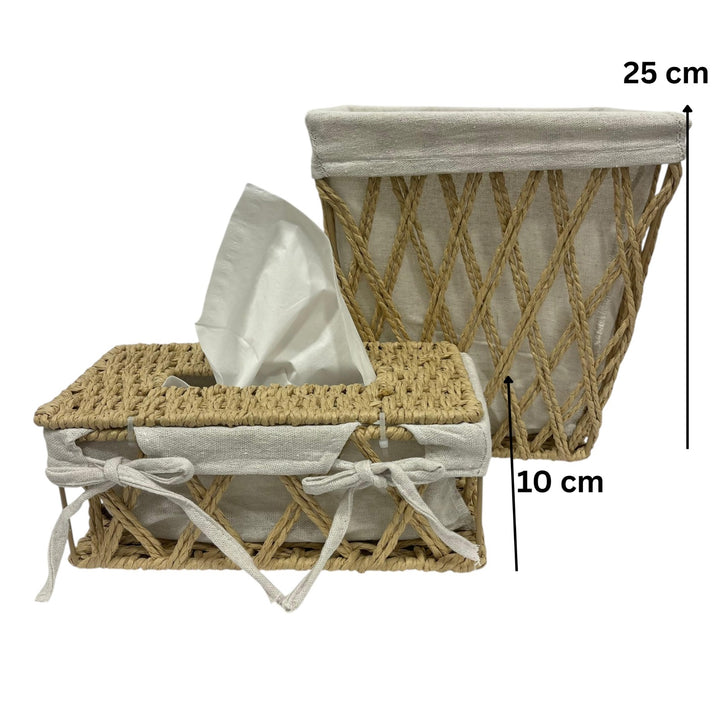 This refined woven storage set includes two white baskets crafted from durable natural fibers. The rectangular basket acts as an elegant tissue box cover, enhanced by a subtle linen ribbon bow for a delicate touch. The larger round basket features a linen liner edged with graceful lace trim, combining practicality with style. With neutral beige and white tones, this set effortlessly