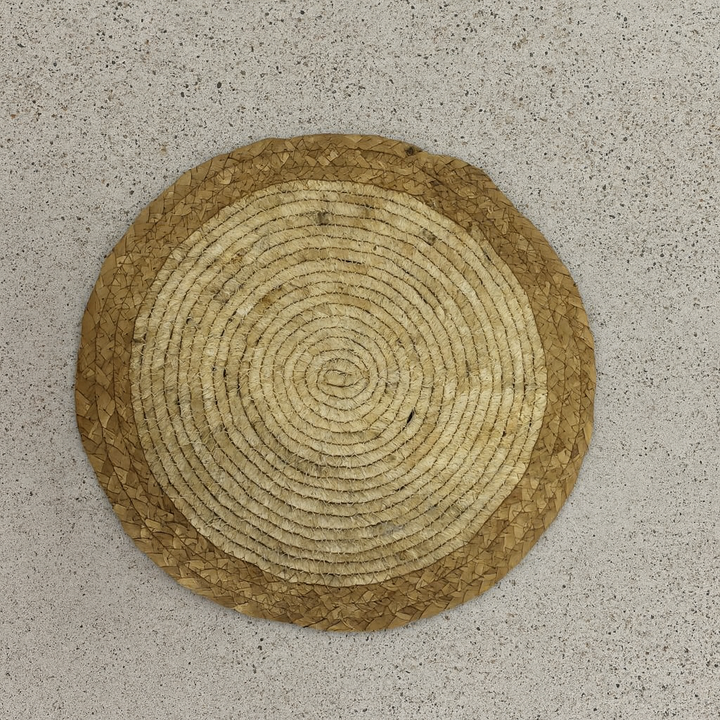 This round woven placemat, crafted from natural straw, combines durability with aesthetic appeal. Its spiral design transitions from a light beige center to a darker brown edge, offering a subtle yet distinctive accent. Ideal for enhancing boho or natural-inspired interiors, it protects surfaces while adding texture and warmth to your dining or living space.