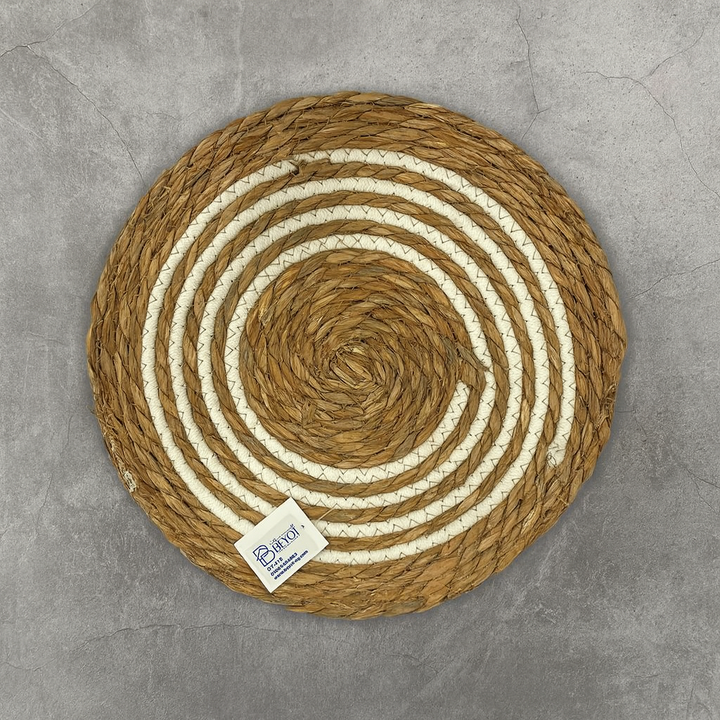 s round woven placemat, crafted from natural straw and cotton, showcases a sophisticated spiral design with alternating beige and white bands. Its blend of rustic charm and refined elegance makes it an ideal accessory for enhancing dining tables, coffee tables, or any decorative arrangement, introducing a subtle natural element with expert craftsmanship.