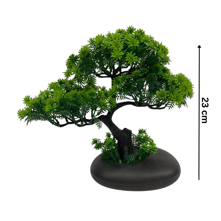 This expertly crafted artificial bonsai tree boasts vibrant green leaves and a realistic black trunk, anchored on a sleek black oval base. Its meticulous design and balanced form add a sophisticated, natural element to modern living rooms, offices, or reception areas. Ideal for enhancing minimalist interiors, this bonsai serves as a refined decorative piece that evokes tranquility and visual harmony.