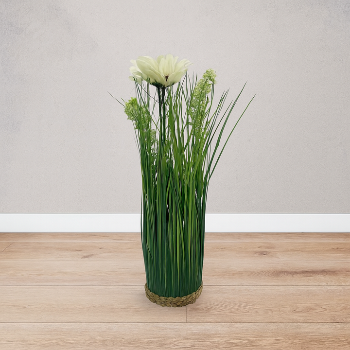 This tall artificial arrangement features slender green grass-like stems paired with delicate yellow flowers, set in a woven natural base. Its sophisticated design adds a subtle touch of nature and color, complementing modern, boho, or minimalist interiors. Ideal for living rooms, offices, or entryways, it offers a hassle-free way to brighten your space with enduring charm.
