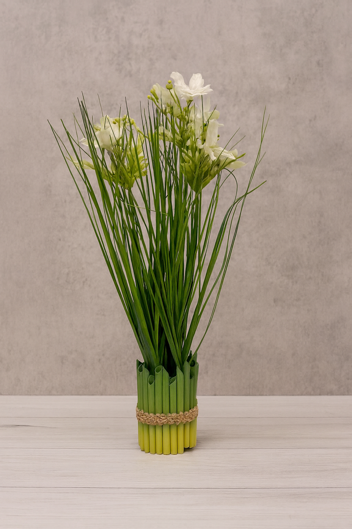 A fresh, nature-inspired artificial arrangement featuring tall green grass stems paired with delicate white blossoms for a soft, elegant look. Presented in a unique stick-style holder in gradient lime and green tones, tied with a natural jute rope for a rustic touch. Perfect for console tables, shelves, desks, or modern boho décor.