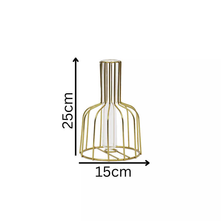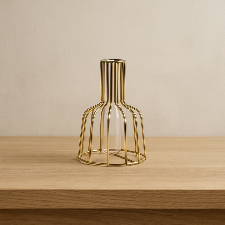 This decorative vase showcases a transparent glass body framed by an elegant golden metal structure with a modern geometric design. Its sophisticated style makes it an ideal accent for contemporary interiors, blending seamlessly with various settings such as tables, shelves, or consoles. Combining functional use with artistic design, it enhances any living area with subtle elegance and refined craftsmanship.