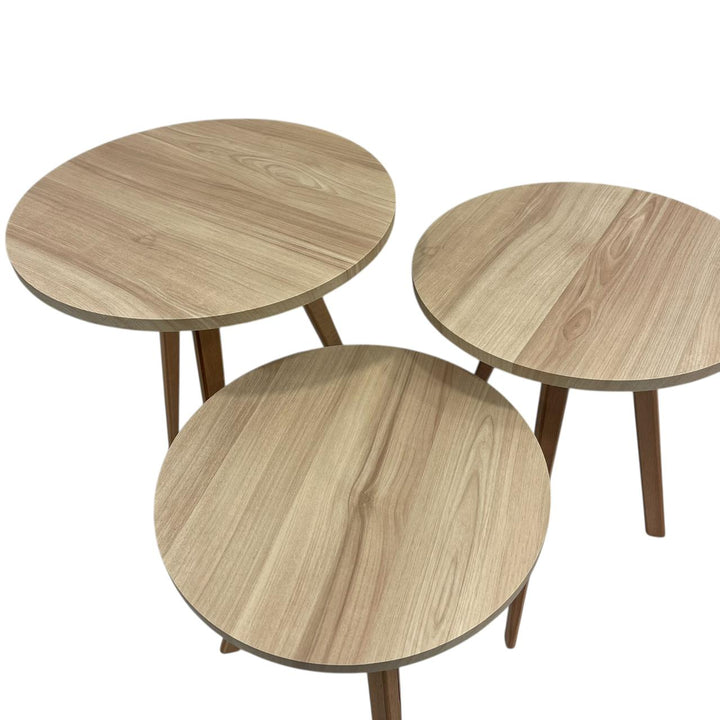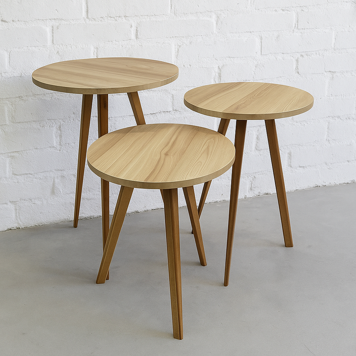 A modern set of three round nesting tables featuring a smooth beige wooden top that adds a fresh and natural touch to any living space. The tables stand on strong beech wood legs, offering stability and durability with a warm, elegant look. Their versatile nesting design allows you to use them together in a layered arrangement or separately around the room. A stylish and practical addition perfect for living rooms, lounges, and contemporary interior décor.
