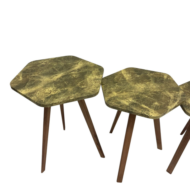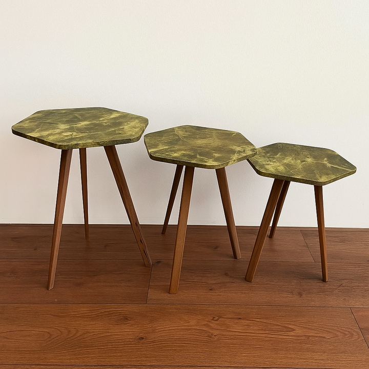 A stylish set of three hexagon-shaped nesting tables featuring a smooth green wooden top that adds a natural and refreshing touch to any room. The tables stand on sturdy beech wood legs, offering excellent stability with a warm and elegant look. Their practical nesting design allows you to use all three together for a layered display or separately around the space. A versatile and decorative addition perfect for modern living rooms, bedrooms, and contemporary interior décor.