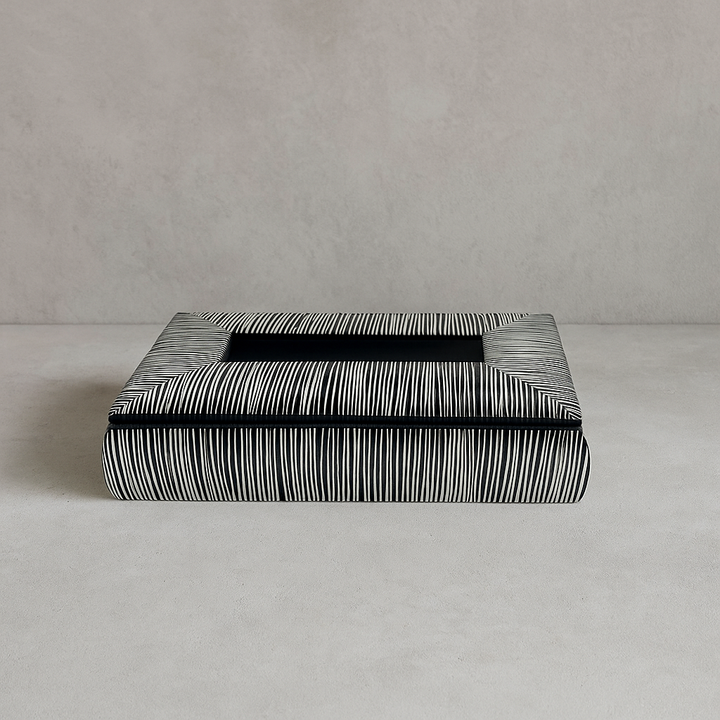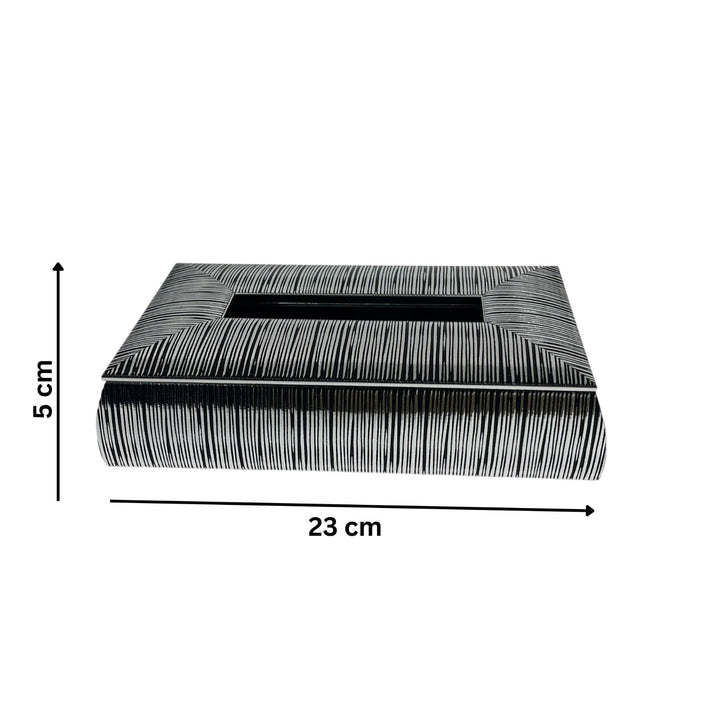 This rectangular tissue box features a modern black and white striped design that complements contemporary interiors with subtle sophistication. Its sleek form adds an elegant touch, making it an ideal accessory for coffee tables, TV units, or office desks. Crafted to combine style and functionality, it enhances any space while keeping tissues conveniently accessible.