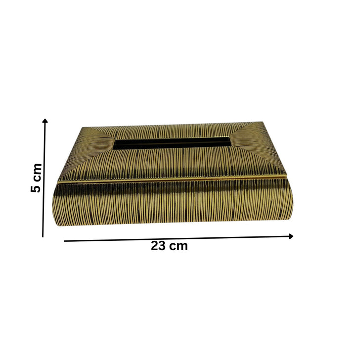 علبة مناديل مستطيلة بتصميم فخم يدمج بين النقوش الموجية باللونين الذهبي والأسود، مما يضفي لمسة راقية تناسب المساحات المعيشية العصرية. تجمع العلبة بين العملية والأناقة، لتكون خياراً متكاملاً ينسجم مع الديكورات الحديثة ويعزز من جمالية المكان.