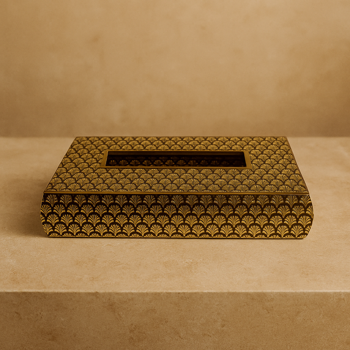 Elevate your space with this luxurious rectangular tissue box cover, featuring an intricate golden fan motif set against a dark base. Its refined design enhances any living room, office, or reception area, providing both functionality and a sophisticated decorative touch. Perfect for those seeking a subtle yet elegant accent.