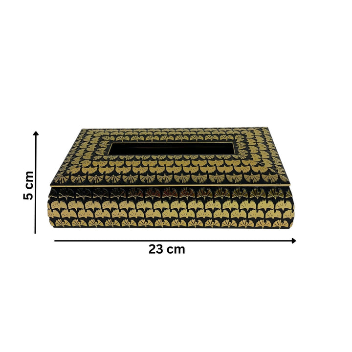 This elegant rectangular decorative box showcases a refined black and gold design, highlighted by detailed golden fan-like motifs that add a touch of luxury and sophistication. Ideal as a multifunctional piece, it serves perfectly as a tissue holder, storage container, or an exquisite accent for both modern and classic interiors, enhancing any space with its timeless style.