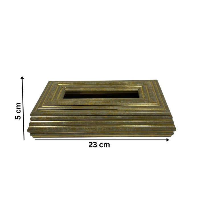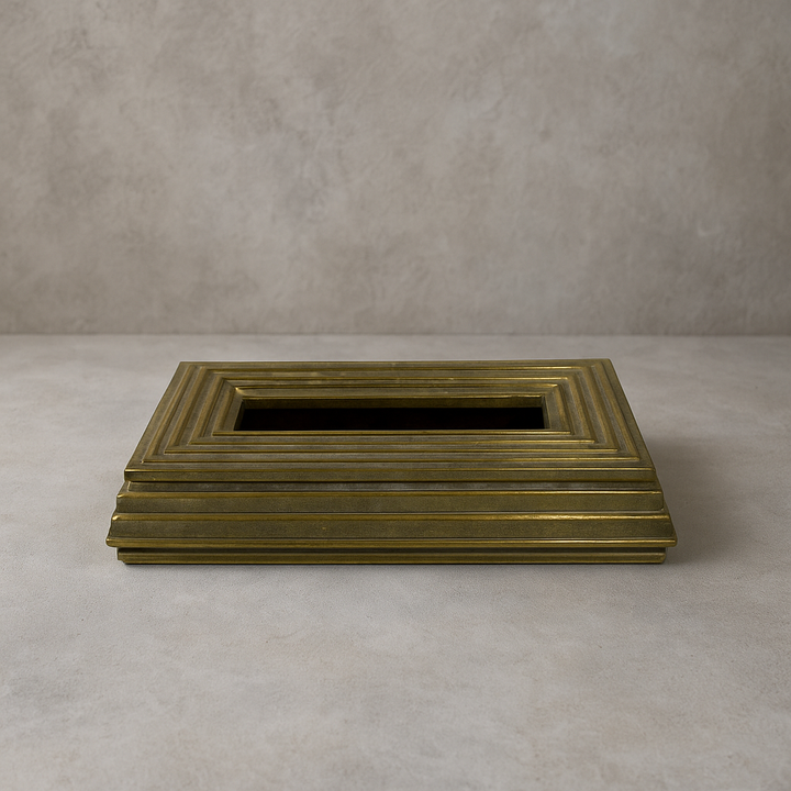 علبة مناديل مستطيلة بتصميم عتيق من النحاس الأصفر، تتميز بتدرجات متدرجة وتصميم هندسي أنيق يمنحها لمسة كلاسيكية راقية. اللون الذهبي المعتق يعزز من جاذبيتها ليكون هذا المنتج قطعة ديكور مميزة تضفي فخامة على غرفة المعيشة أو المكتب أو مناطق الاستقبال.
