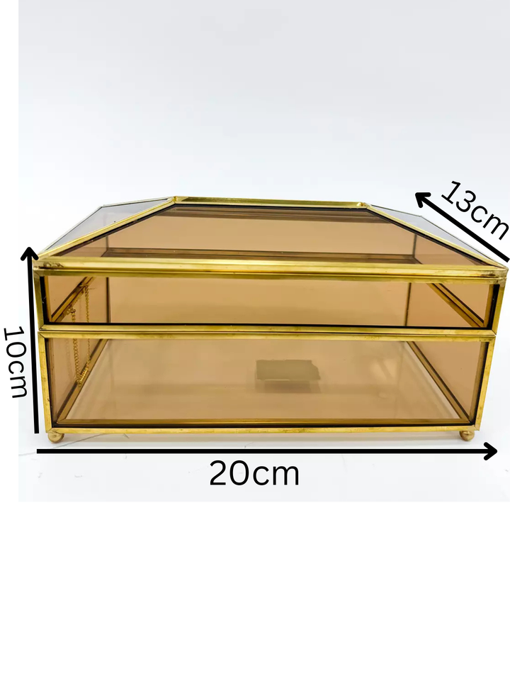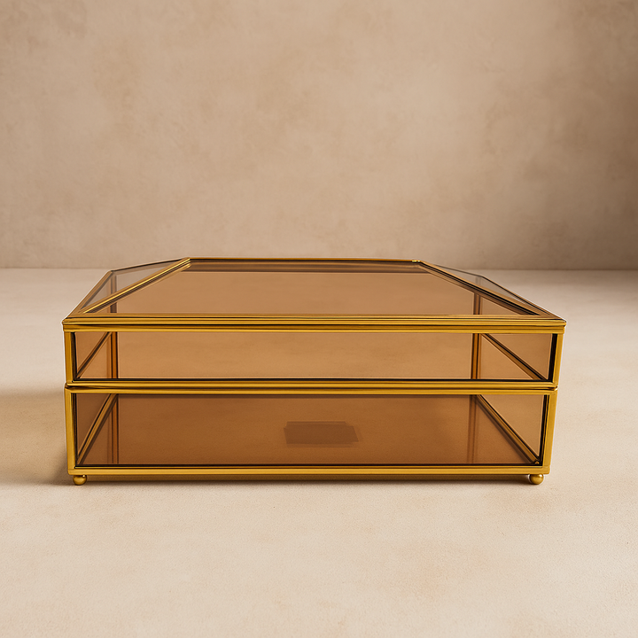 This elegant tissues box features amber-tinted glass panels set within a golden metal frame, offering a refined geometric design. Combining modern style with classic appeal, it provides an attractive and functional way to store tissues, enhancing any dresser, vanity, or coffee table with a sophisticated touch.