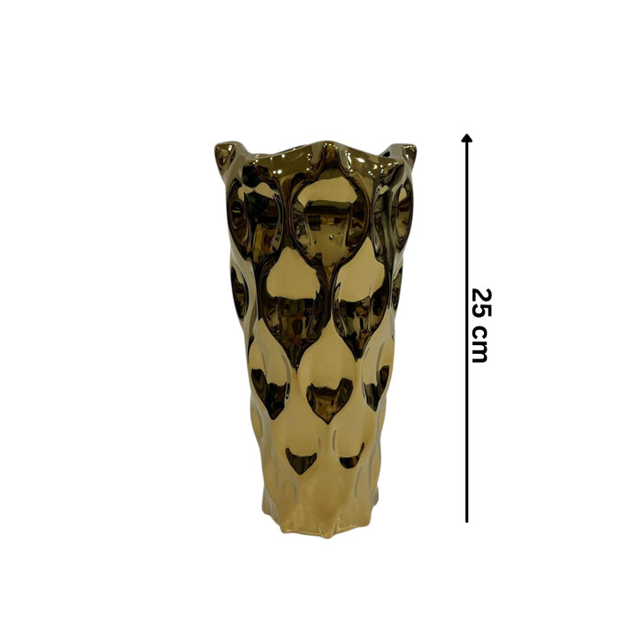 مزهرية فاخرة بتصميم مجسّم لامع باللون الذهبي، مزودة بملمس مميز يشبه الطبقات المتداخلة أو القشور. يتميز الجزء العلوي بحافة مموجة تضيف لمسة فنية وجاذبية عالية، مع سطح عاكس يمنحها حضورًا قويًا في المكان. قطعة مثالية للعرض على الكونسول أو البوفيه أو الطاولات الجانبية، وتضيف فخامة وأناقة لأي ديكور عصري.