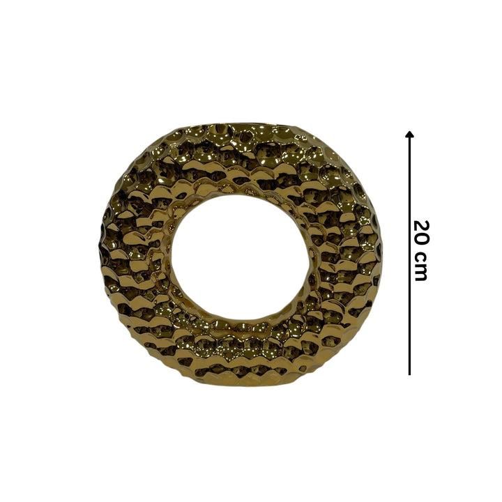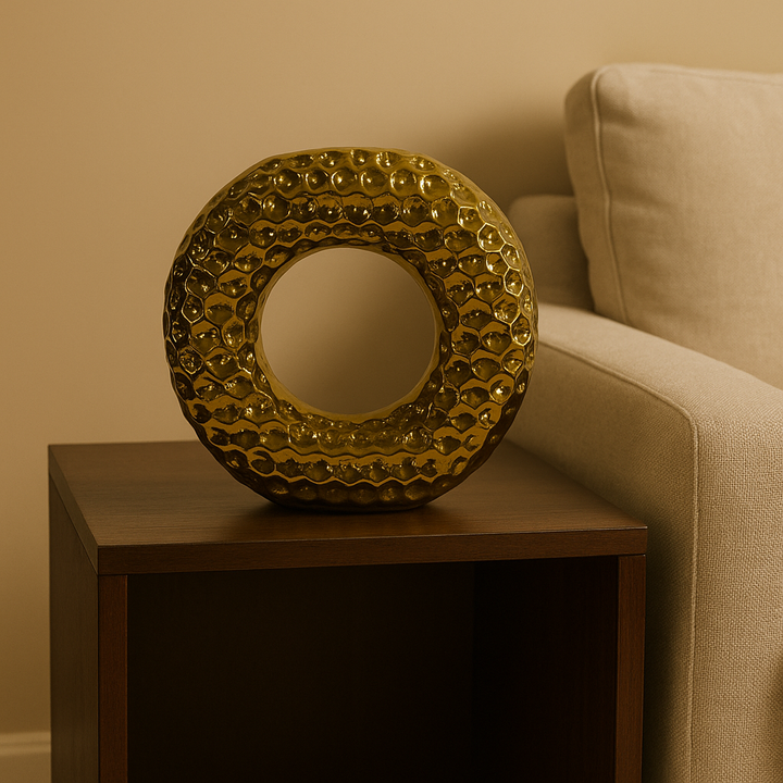 A modern decorative sculpture designed in a circular ring shape with a rich amber-gold finish. The surface features a raised honeycomb-like texture that reflects light beautifully, creating depth and a luxurious visual effect. Perfect for styling consoles, side tables, bookshelves, or living room setups, this piece adds a warm contemporary touch to any space.