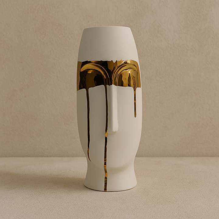 A modern sculptural vase designed in a matte ivory finish with an abstract facial outline. The upper section is adorned with a dramatic gold “melted” effect that flows gracefully over the face, creating a bold artistic statement. Its sleek shape and luxurious gold detailing make it a perfect accent piece for consoles, shelves, and modern living spaces—adding personality and sophistication to any décor.