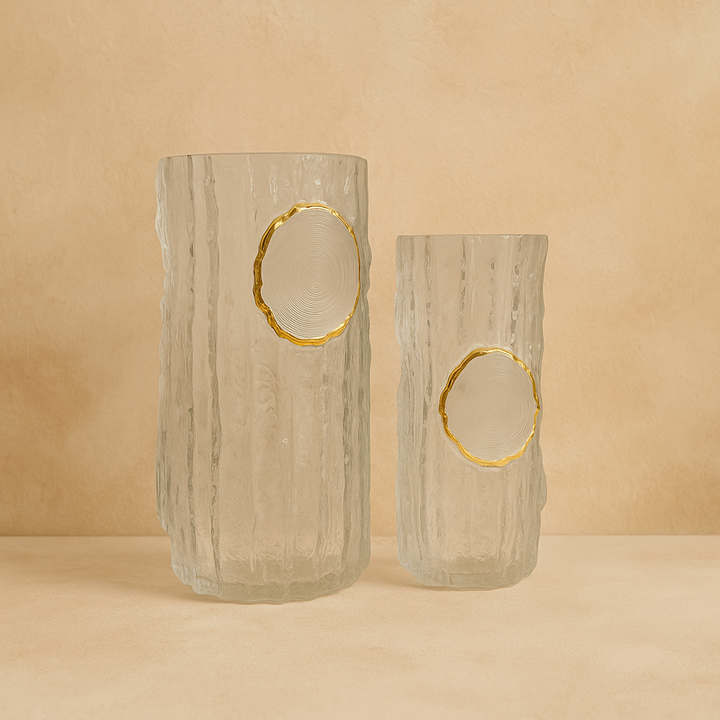 A sophisticated two-piece vase set crafted from textured frosted glass, inspired by natural tree-bark patterns. Each vase features a circular gold-rimmed accent that adds a refined touch and elevates the organic design. Their tall cylindrical shape and artistic detailing make them perfect as statement pieces on consoles, buffets, side tables, or styled with dried florals for a warm, contemporary look.