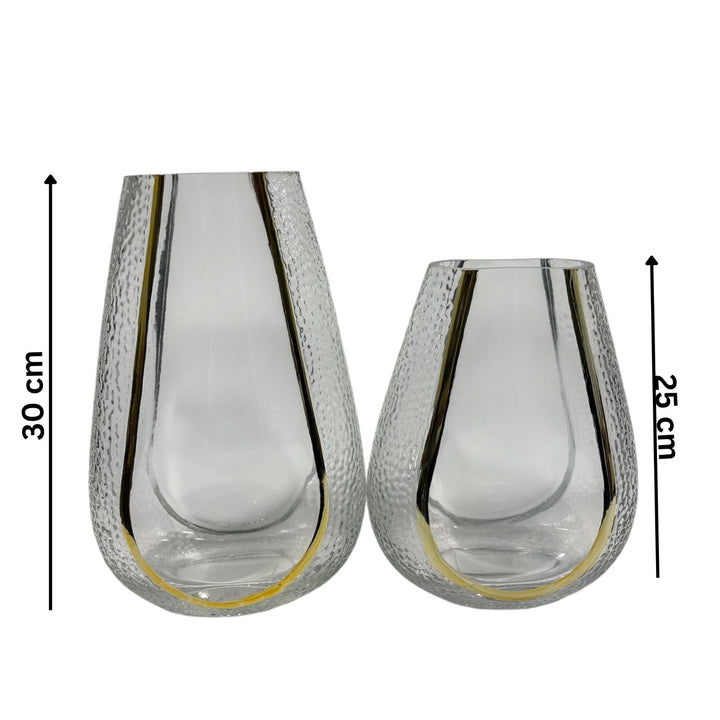 A refined two-piece glass vase set featuring a modern tear-drop silhouette with a smooth, crystal-clear finish. Each vase is accented with a sleek gold curved line that adds a luxurious touch and enhances the contemporary design. Perfect for styling consoles, sideboards, coffee tables, or shelves—whether displayed together as a coordinated set or separately to complement different corners of your space.