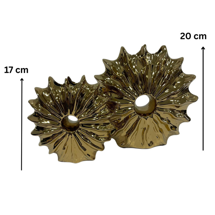 This elegant decorative set includes two sculptural pieces finished in radiant gold with a sunburst-inspired design and a central circular opening. Their glossy surfaces enhance light reflection, creating captivating focal points that elevate modern and luxurious interiors. Perfectly suited for console tables, TV units, or shelving, these pieces introduce a refined artistic element, adding depth and sophistication to any space's decor