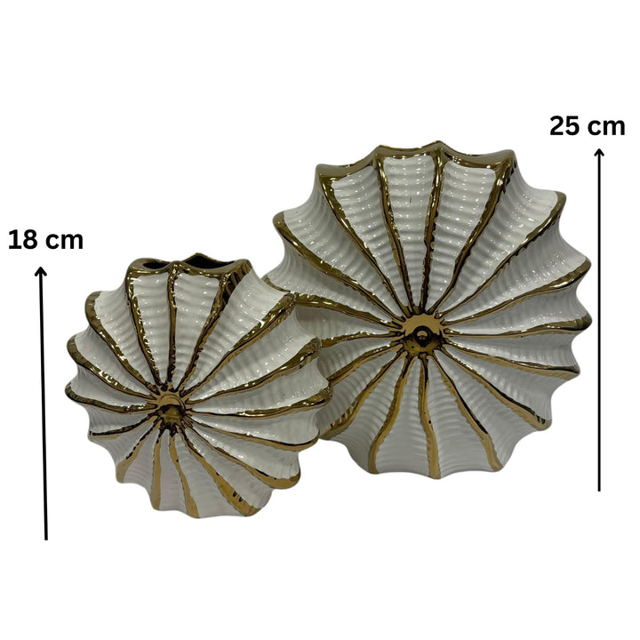 Elevate your space with this elegant decorative vase set featuring a distinctive round fan-shaped design. Crafted from white ceramic and accented with refined gold lines radiating from the center, each piece embodies a blend of luxury and modernity. Ideal for enhancing living rooms, consoles, or shelves, this set serves as a sophisticated statement on its own or complements other décor seamlessly.