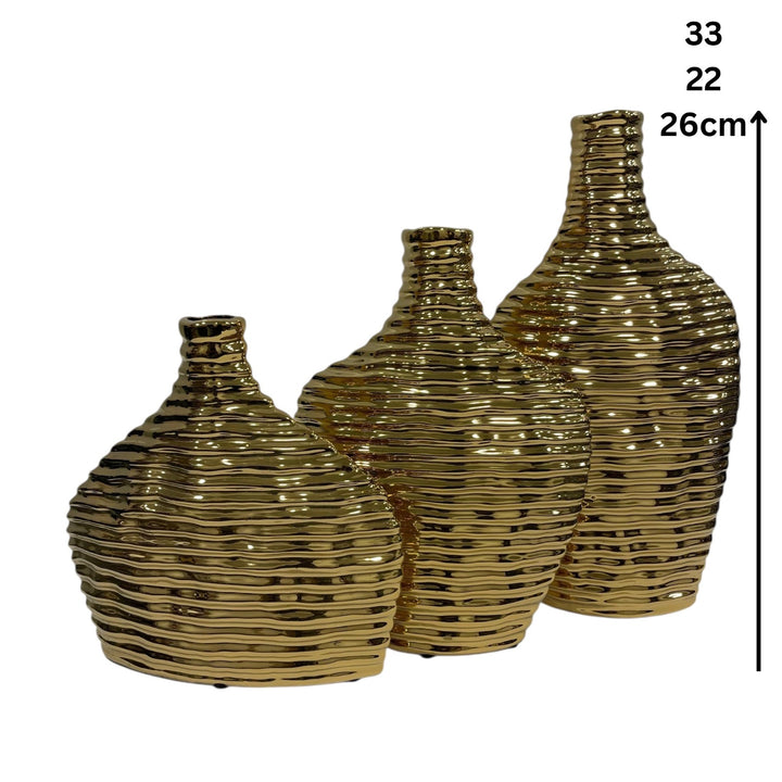 A stunning set of three modern vases crafted in a glossy gold finish with a flowing wavy texture that creates movement and luxurious reflections. Each vase features a unique silhouette, making this trio perfect for styling consoles, dining buffets, coffee tables, and shelves. Display them together for a bold statement or separate them to add a touch of elegance across different spaces.