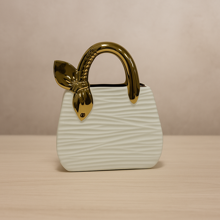A charming decorative piece designed in the shape of a handbag, featuring a textured matte ivory body and a striking glossy gold handle adorned with delicate leaf details. This modern and feminine sculpture adds a touch of elegance and luxury to consoles, vanities, side tables, and living room décor. A perfect accent piece that brings uniqueness and sophistication to any space.